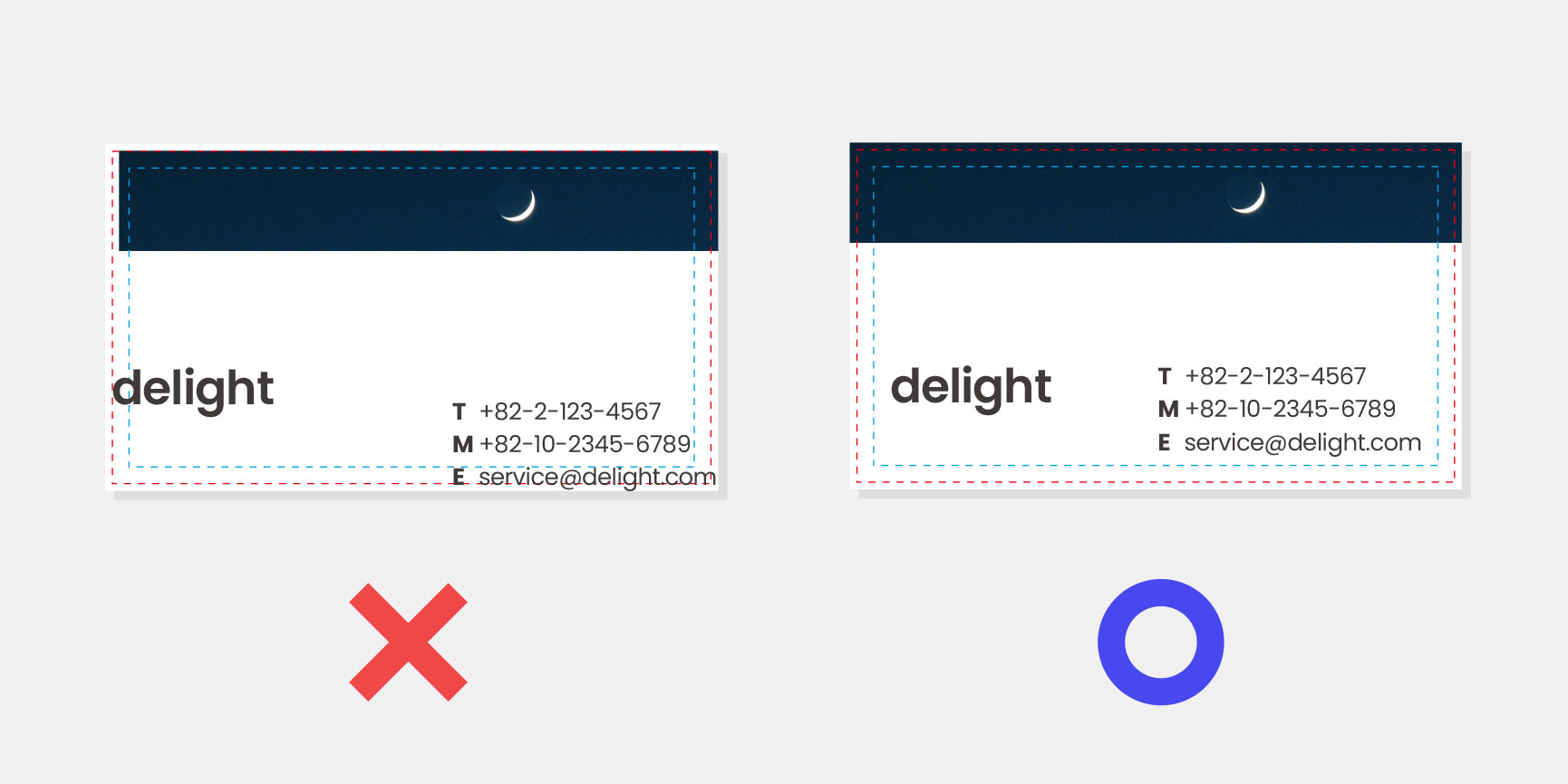 배경이미지가 있는 경우 인쇄공정 특성상 종이 끝부분까지 완벽하게 인쇄하기가 쉽지 않습니다. 따라서 실제 재단되는 영역보다 좀더 크게 배경이미지를 인쇄하여 정사이즈로 재단을 합니다. 실제 재단되는 부분부터 좀더 크게 인쇄된 영역을 전문용어로 블리드(=Bleed)라고 합니다.