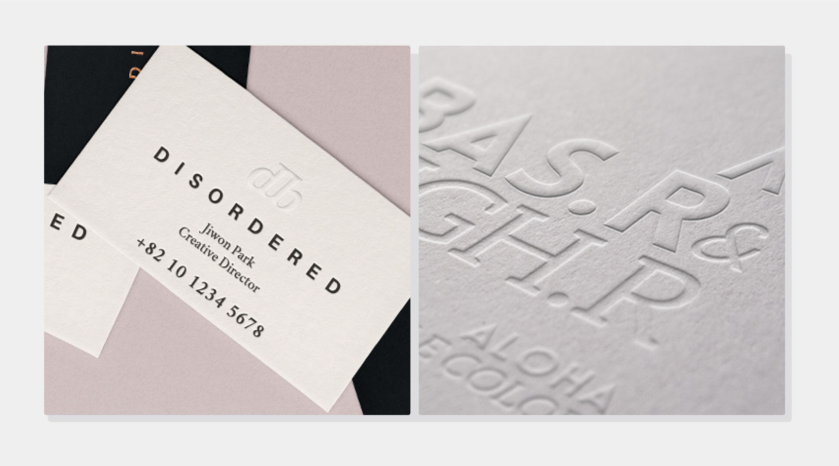 형압은 포인트를 줄 특정부위를 돌출시키거나 오목하게 만들 수 있는 입체적인 가공법입니다. 손으로 느껴지는 돌출부위는 쉽게 잊혀지지 않으며 브랜드 인지도 향상에 도움이 됩니다.